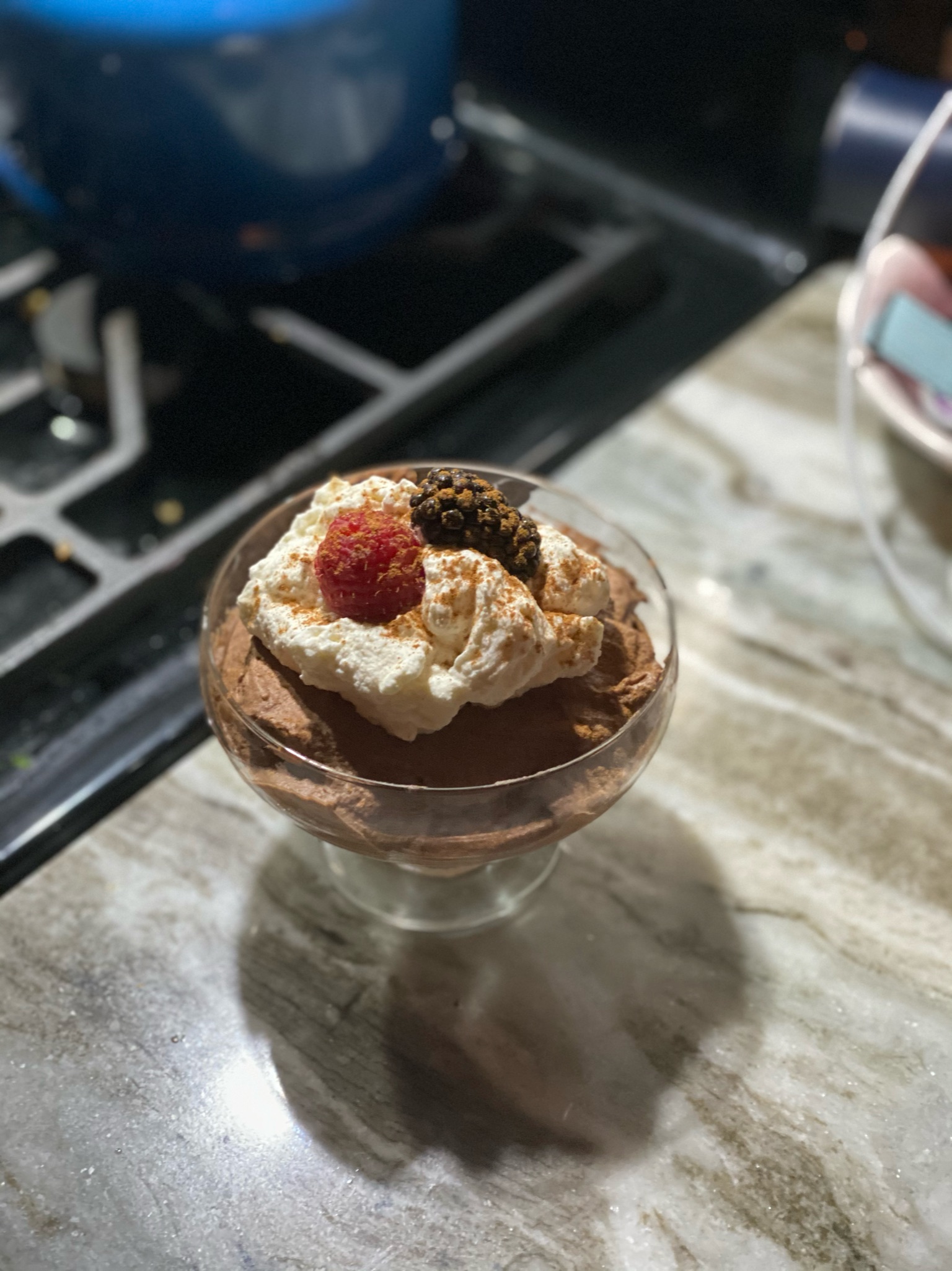 Get out one large heatproof, two medium and one small mixing bowl and dust off your electric hand mixer. Set the large bowl over a saucepan of barely simmering water and melt the chocolate and butter in it, gently stirring it until smooth. Remove from heat. Alternately, you can melt them in your microwave, stirring thoroughly at 30 seconds and every 15 seconds thereafter until the mixture is smooth. In the small bowl, beat yolks with your electric mixer until thick enough to form a ribbon that takes a few seconds to dissolve — this will take about two to four minutes to achieve. Whisk yolks into chocolate mixture along with rum, then cool to warm. In one of the medium bowls, beat the cream with cleaned beaters until it just holds stiff peaks. In the other medium bowl, beat the egg whites and salt with cleaned beaters until they just hold soft peaks. Fold the whipped cream and beaten whites into the chocolate mixture, gently but thoroughly. Transfer to 8 (4 ounce) ramekins or one large serving bowl, or go restaurant-style, serving it in stemmed glasses with white or dark chocolate shavings on top. Do ahead: Mousse can be chilled, its surface covered with parchment paper, up to 2 days, though I’ve never heard of it lasting that long with hungry people named Deb around. Let stand at room temperature at least 30 minutes before serving.