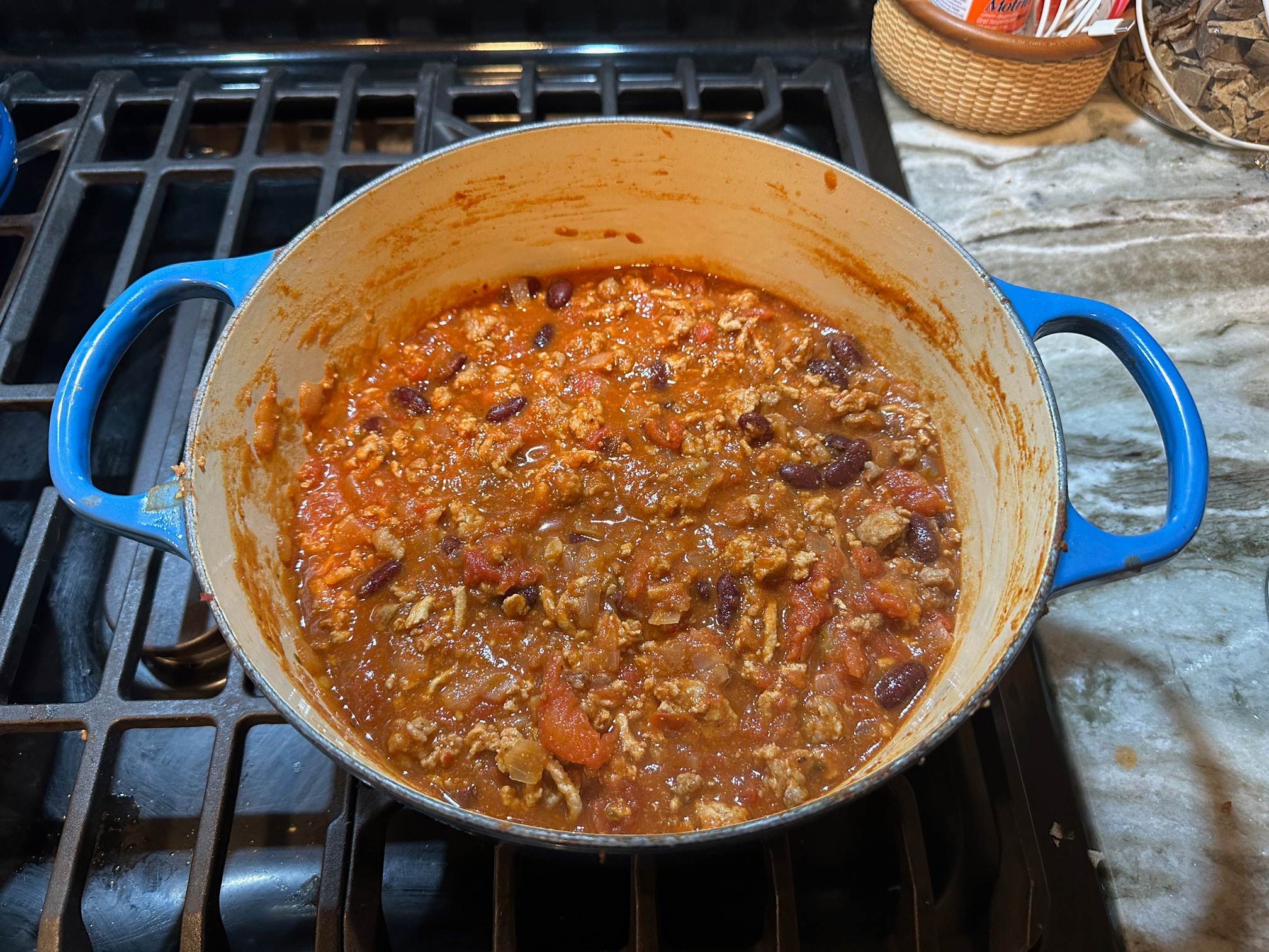 Heat dutch oven on largest burner to medium. Thinly coat with canola oil and brown sausage. Empty pot into separate bowl. Some fat left over is good, but wipe out any solids that will burn. Add onion, season with salt & pepper, and cook until they start to look golden. Add a little butter if they start to burn. Add turkey, stiff frequently until no longer pink. Add sausage back in -- I withhold most of the drained fat. Add beef broth. Mix well. Add entire can of tomatoes, but discarding basil leaf, if needed. Use a splash of white wine, or water, to rinse the can and add to the pot. Add half the tomato paste. Season liberally with cumin to coriander, 2:1. A little chili powder or red pepper flakes. And oregano. Stir, smashing tomatoes. Lid on, bring to a boil then down to a simmer. Stir, taste, and add more seasoning as needed every ~5ish minutes until it tastes like chili, about 15 min. Then move the lid to partially cover, so it can reduce. Continue checking and stirring until it reaches desired thickness, about 20 min. Optionally add more tomato paste to help it along.
