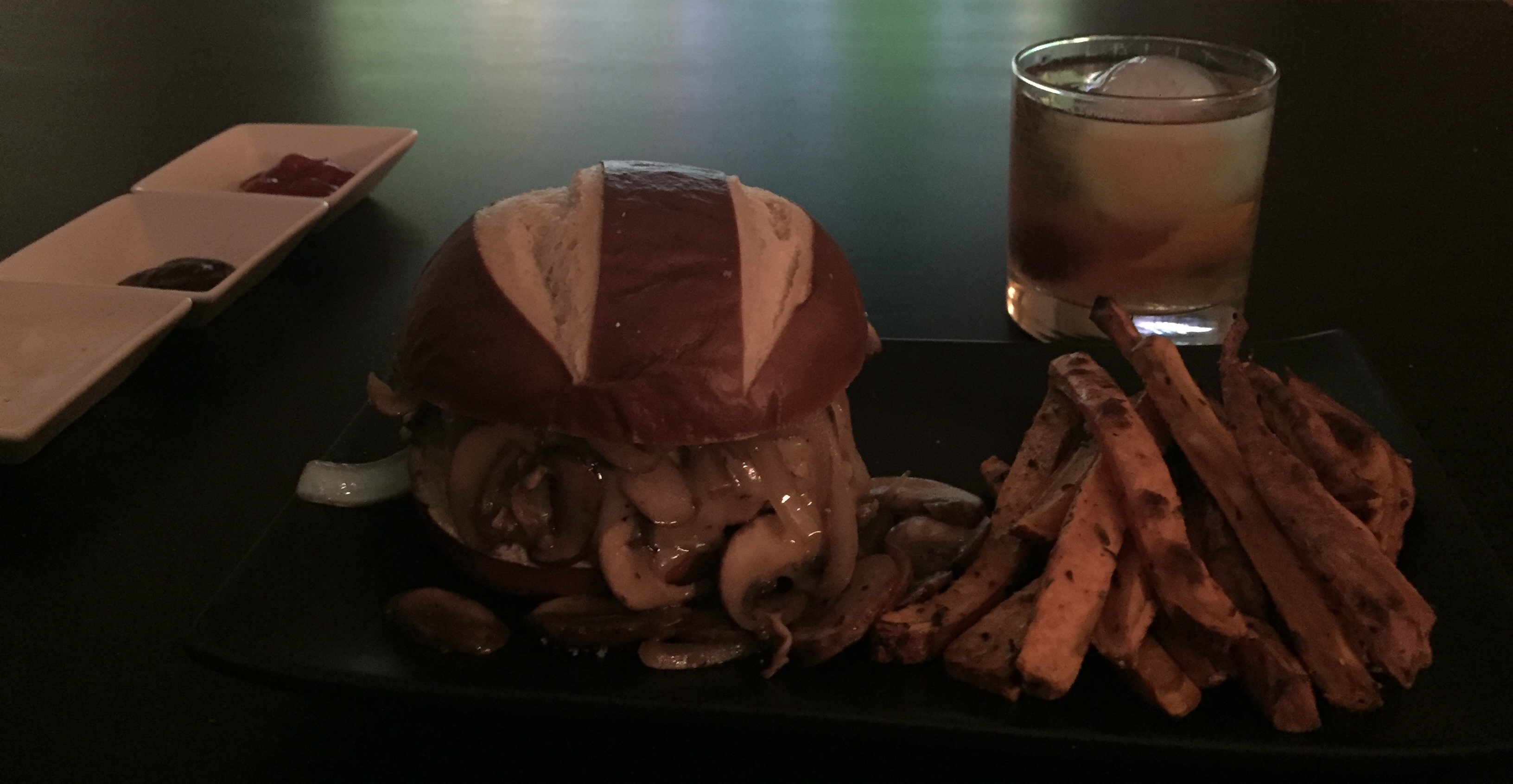 1.3lbs Ground Turkey, 93% Lean 1 egg yolk season salt season pepper garlic powder herb de provence 1 tbsp unsalted butter half yellow onion 4 Baby Bella Mushrooms, sliced thinly Sharp cheddar or swiss cheese Pretzel buns 1 large sweet potato olive oil Thyme sea salt