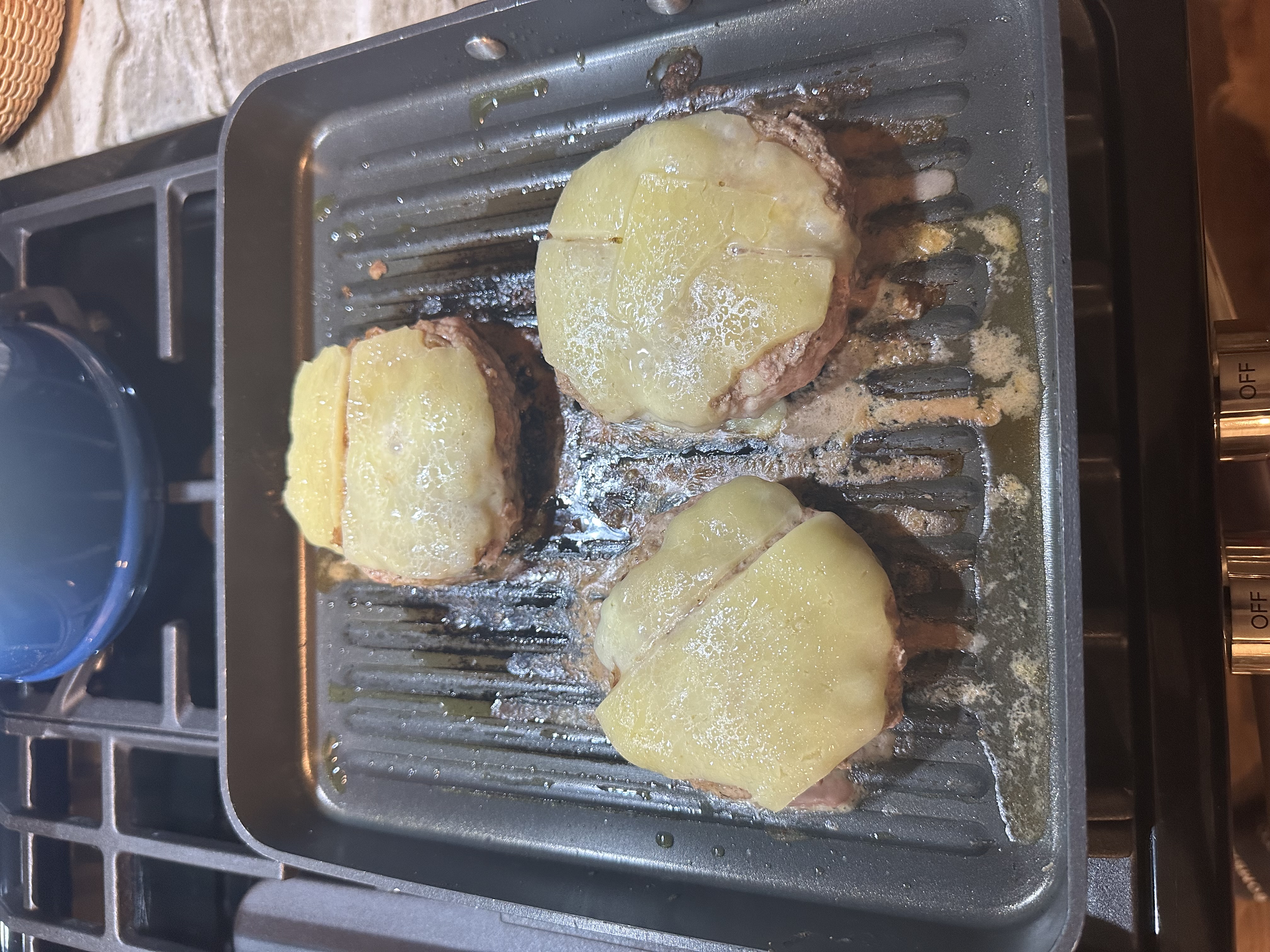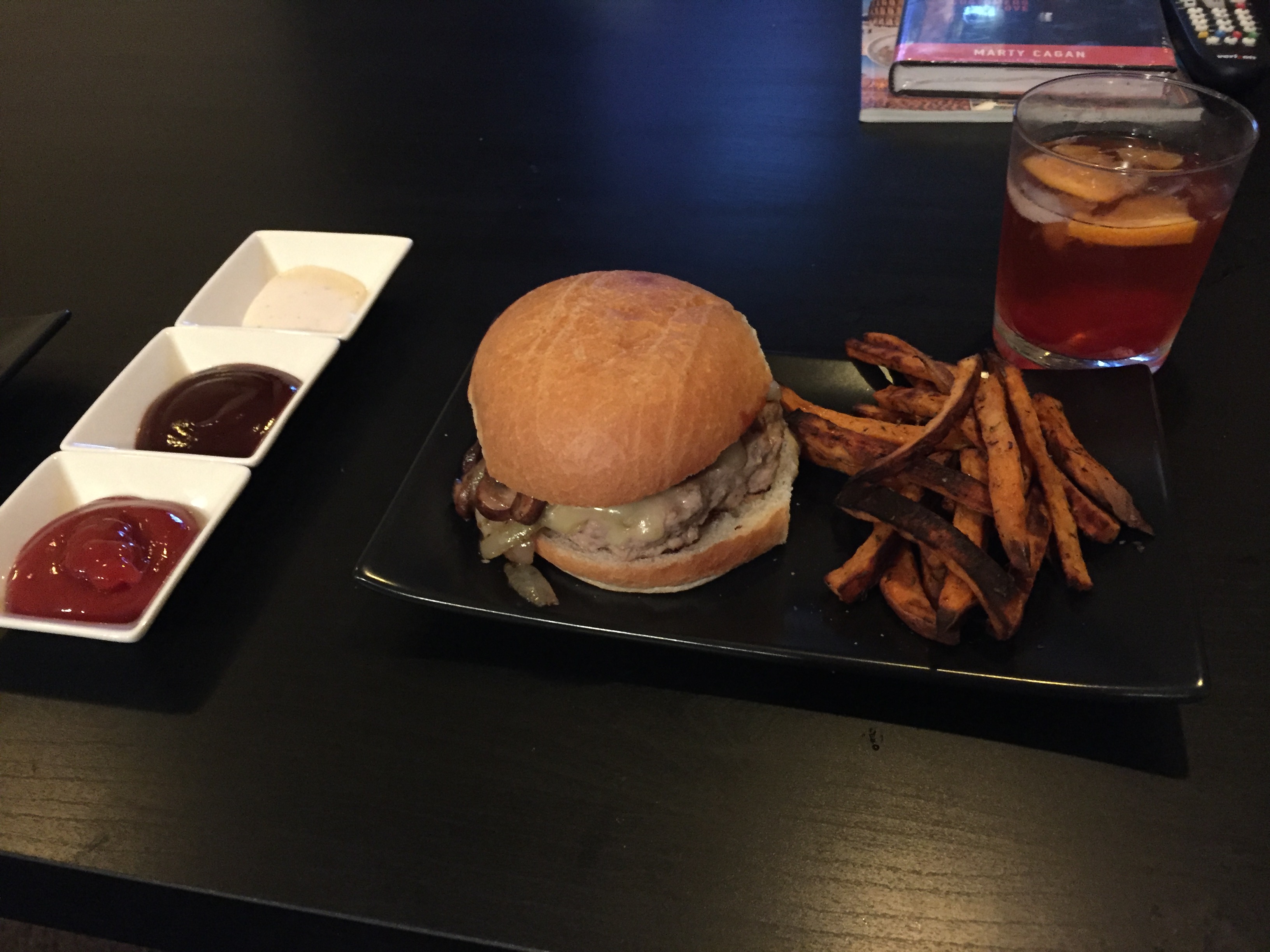 Preheat oven to 425. With large sharp knife, top & tail sweet potato, slice into fries, leave skin on. Toss in large bowl with just enough olive oil to coat. Add sea salt and thyme to taste. Spread into a single layer on a parchment-lined baking sheet. Bake until edges are slightly blackened, about 40 minutes. Feed discarded potato to nearest puppy. Combine burger ingredients, shape into 3 patties. Let sit to get to room temperature. Preheat grill pan to medium-high on largest burner, thinly coat with olive oil. Seer patties, roughly 5 min per side, or until visibly cooked. After flipping, add cheese. While burgers are cooking, in a small or medium fry pan, melt butter, then sauté onions with season salt, pepper, & garlic powder, until they begin to look translucent. Add mushrooms. You may need additional butter to fully coat mushrooms. stir frequently. Halve buns and warm in oven for 1-2 minutes. Serve with ranch, BBQ sauce, & ketchup.