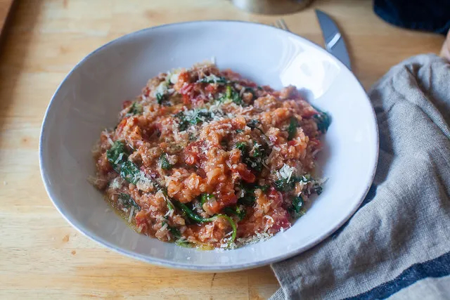 1 can (28 ounces) diced tomatoes in juice 1 tablespoon olive oil 3/4 pound sweet or hot Italian sausage, casings removed 1 small onion, finely chopped Coarse salt and ground pepper 1 cup arborio rice 1/2 cup dry white wine 1 bunch flat-leaf spinach (10 to 14 ounces), washed well, tough stems removed, chopped (about 7 cups) 1/2 cup grated parmesan cheese, plus more for serving 2 tablespoons butter